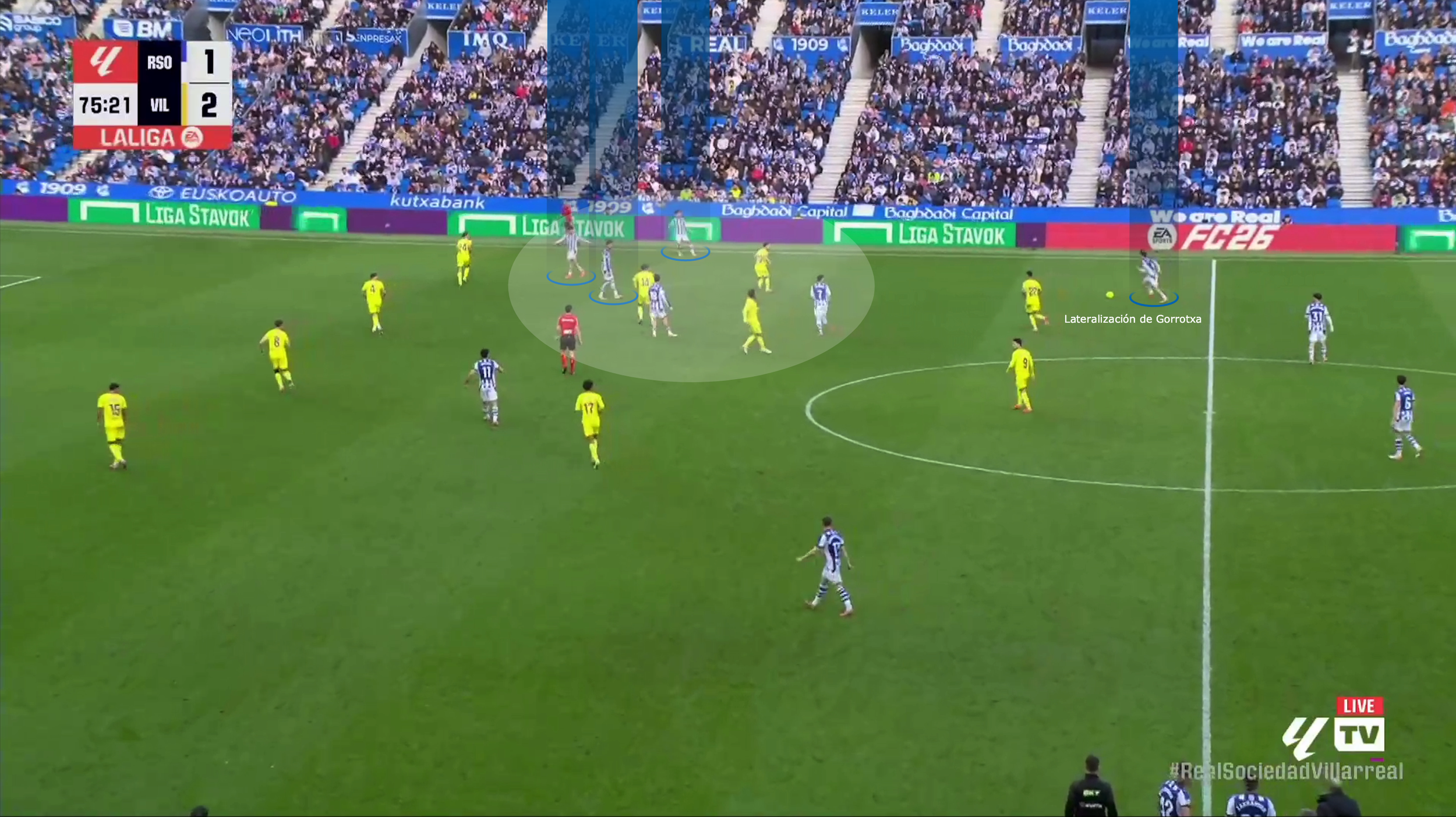 Sin balón, el equipo compitió con mucha solvencia. El Villarreal, con posesión, pasaba de su 4-4-2 defensivo a un 3-4-3, con Pedraza muy alto y Moleiro apareciendo por dentro. Para controlar esos movimientos, la Real formó una línea de cinco en muchos tramos, con Gorrotxategi incrustándose en esa línea para vigilar de cerca a Moleiro y evitar que recibiera con comodidad. En los inicios estáticos desde portería, el Villarreal sí podía hacerlo con cuatro atrás, y ahí la Real ajustó muy bien su presión: Sadiq y Kubo se encargaban de los centrales y Aramburu ganaba altura en una posición intermedia que le permitía, en cuanto Kubo saltaba, atacar con agresividad al lateral rival. Cuando el Villarreal ya tenía montada su línea de tres, Kubo se emparejaba con el central izquierdo, Guedes con el derecho y Sadiq con el central del centro. A partir de ahí, la Real orientaba bien y saltaba con mucha agresividad cada vez que uno de los centrales exteriores recibía o ante cualquier pase atrás. Fue, en mi opinión, una presión excelente durante muchísimos tramos del partido, con una coordinación muy alta entre líneas y una gestión brillante de esas alturas intermedias por parte de Aramburu, como se vio en la acción del gol. Esta agresividad colectiva también se refleja en el dato: la Real firmó un PPDA de 6, es decir, permitió únicamente seis pases del Villarreal por cada acción defensiva propia. Es un valor bajísimo, propio de equipos que presionan muy alto y muy bien, y resume a la perfección el trabajo del equipo sin balón. Gracias a ello, se produjeron numerosas recuperaciones en campo rival. El gol de Soler nace precisamente de una de estas acciones: Guedes orienta al portero, Kubo salta con decisión y Aramburu llega rápido para ir a por el lateral rival, forzando entre todos el error que acaba en el 1-0. El segundo gol también aparece tras una recuperación alta de Goti que termina en falta. Al final, los tantos encajados llegan por detalles puntuales: una ayuda que no llega, una pérdida castigada y una acción a balón parado aislada, más que por problemas estructurales en el bloque defensivo.